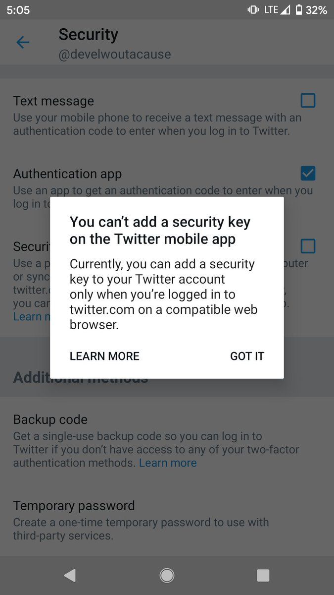 So apparently Twitter's Android app doesn't do security keys for two-factor auth. I had to switch to their PWA to set one up. This might be the first time I've seen a native app redirect me to a web app like this.